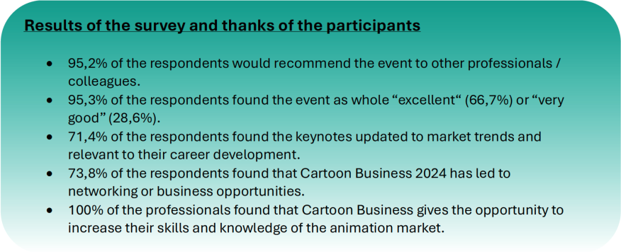 Cartoon Business is a seminar event dedicated to the business models of the animation industry. This industry is going through a period of unprecedented change (general market recession, new technologies, new players, growing ecological awareness, etc.). It has never been so important to provide answers to the questions raised, particularly on the financial and commercial aspects that are worrying the industry. The 2024 edition of Cartoon Business was organised from 18 to 20 November in Brussels.