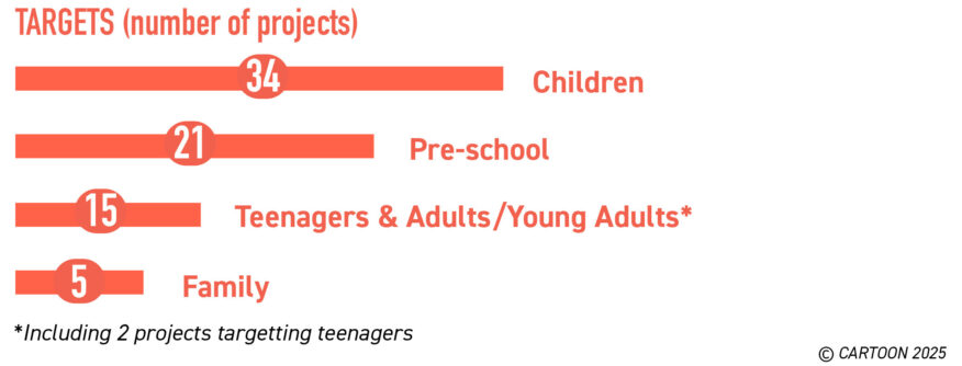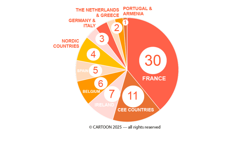 France led the line-up with 30 projects, followed by Ireland with 7, Belgium with 6, Spain with 5, and Poland with 4. Germany and Italy were represented by 3 series each, while Czechia, the Netherlands, Greece, and Serbia participated with 2 each. Projects from CEE countries continued to grow after almost doubling their presence from 6 projects in 2019 to 11 in 2025, including 4 from Poland, 2 from Serbia, 2 from Czechia, and one each from Bosnia, Latvia and Bulgaria. Already representing 15% of the selection, this steady trend by the CEE countries confirms the growth of animation production outside Europe’s mainstream animation markets.
