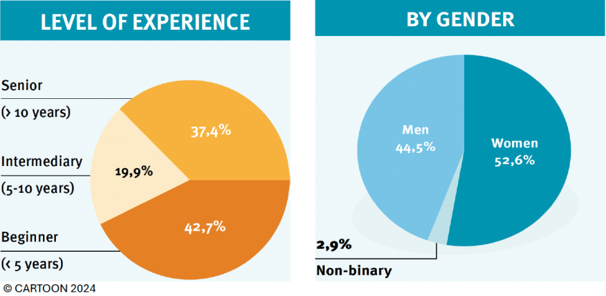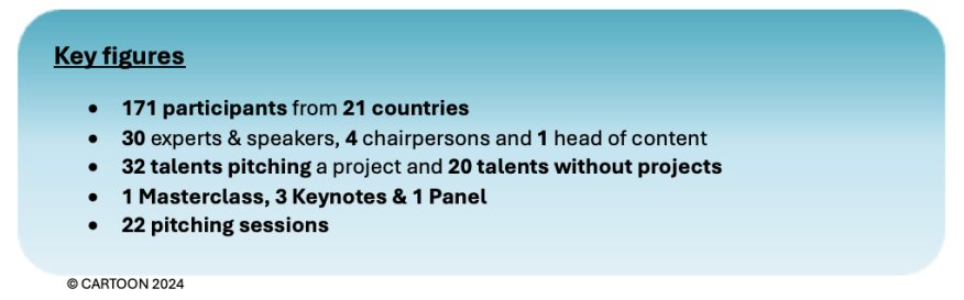 The number of participants shows a constant interest in the event. 171 participants registered at Cartoon Springboard Madrid in 2024. This year’s participants came from 21 different countries. This shows the importance of the event worldwide for European talents and professionals.